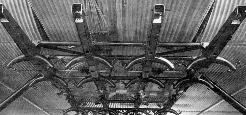 16 подвесных устройств, чем-то похожих на гробы без крышек, в которые забирались десантники. В этих «гробах», практически без движения, они находились до момента выброски. Когда этот момент наступал, штурман дергал рычаг, и все 16 люлек переворачивались, а красноармейцы летели вниз. Без какой-либо сигнализации и команды. Очень своеобразные устройства. Хорошо, что их забраковали.