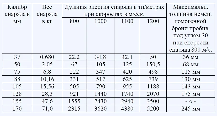 1) Бронепробивное действие немецких и отечественных снарядов крупного калибра (88–152 мм) по гомогенной броне средней твёрдости весьма эффективно лишь при обстреле по нормали или при небольших углах встречи от нее. При этих условиях испытания бронебойные снаряды при скоростях встречи с броней около 1000 м/сек. способны пробить броню толщиной в два с лишним раза превышающей калибр снаряда.