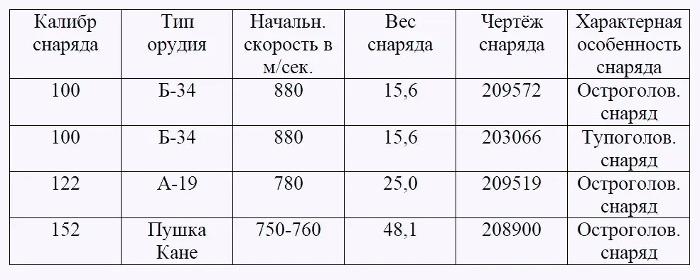 Основные характеристики бронебойных снарядов 100, 122 и 152 мм.