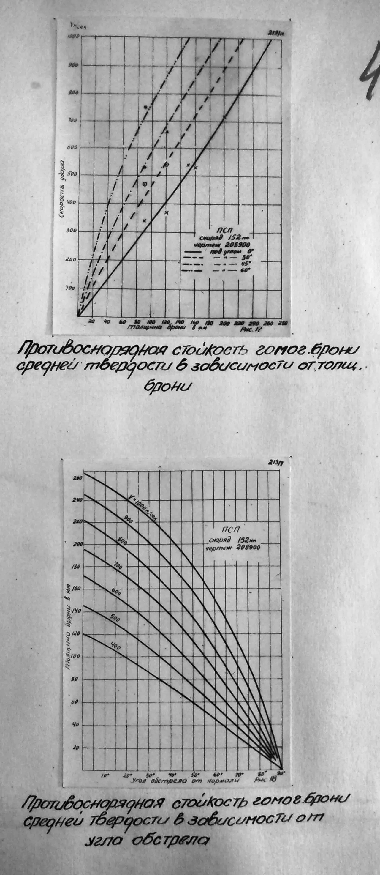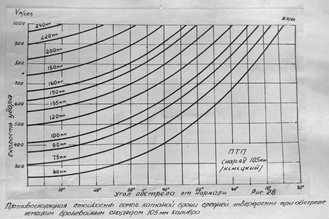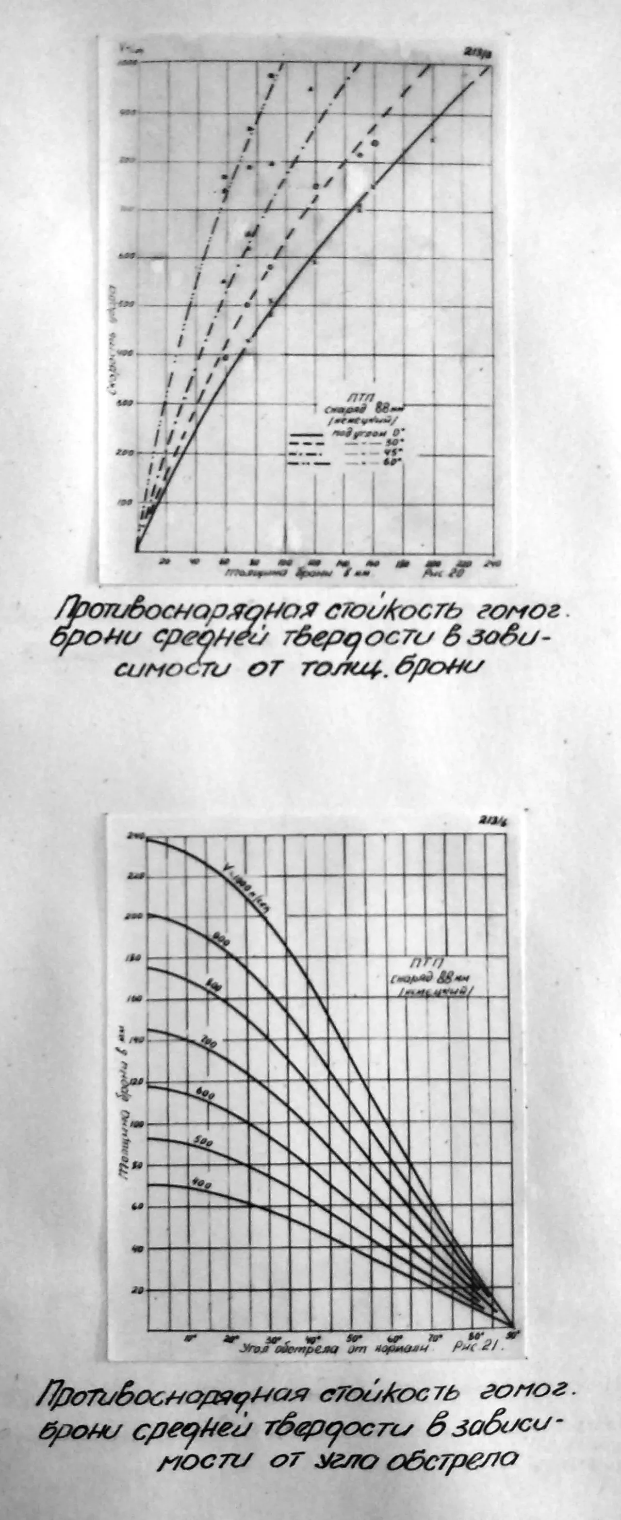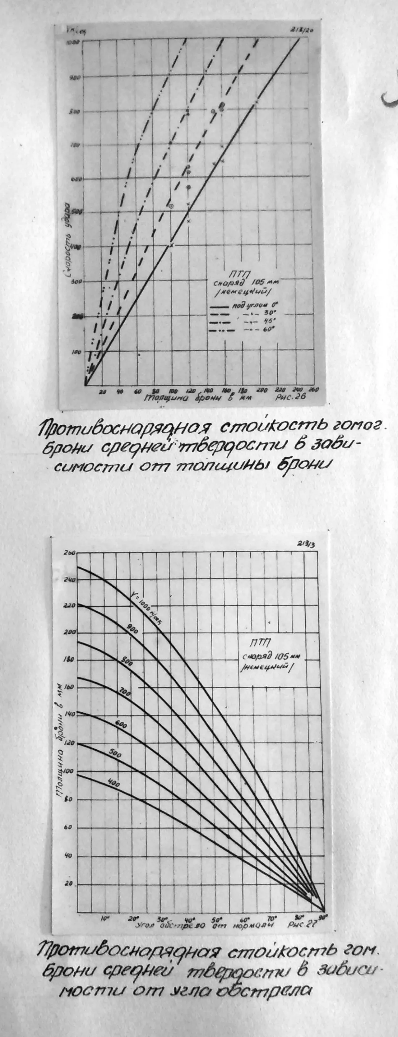 Однако, используя трофейные материалы Хиллерслебенского полигона, подробно о которых будет сказано ниже, данные Кубинского полигона по испытанию опытного объекта «260» немецкими 128-мм снарядами и имеющиеся данные по обстрелу отечественной брони немецкими снарядами меньших калибров, расчетным путем были получены тактические диаграммы противоснарядной стойкости отечественной гомогенной брони также против снарядов и этого калибра.