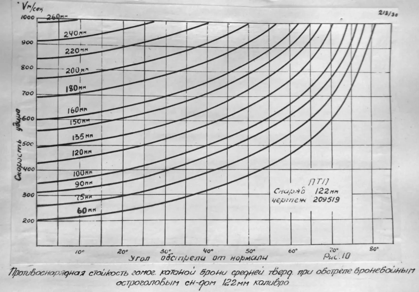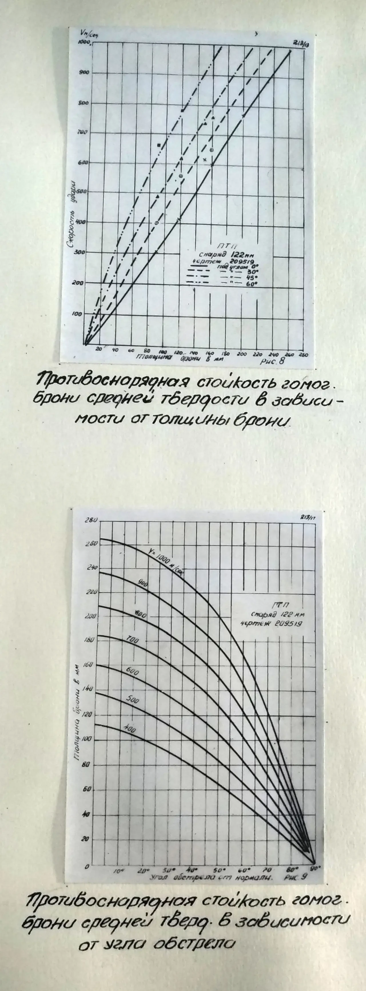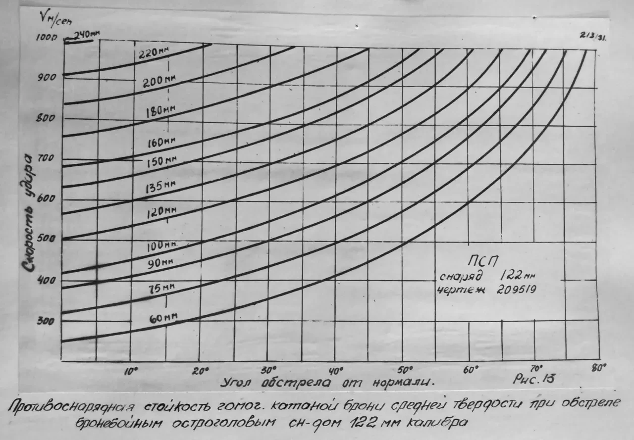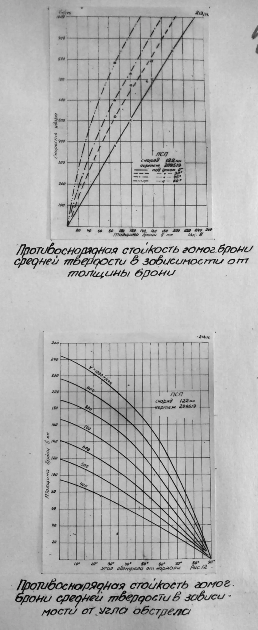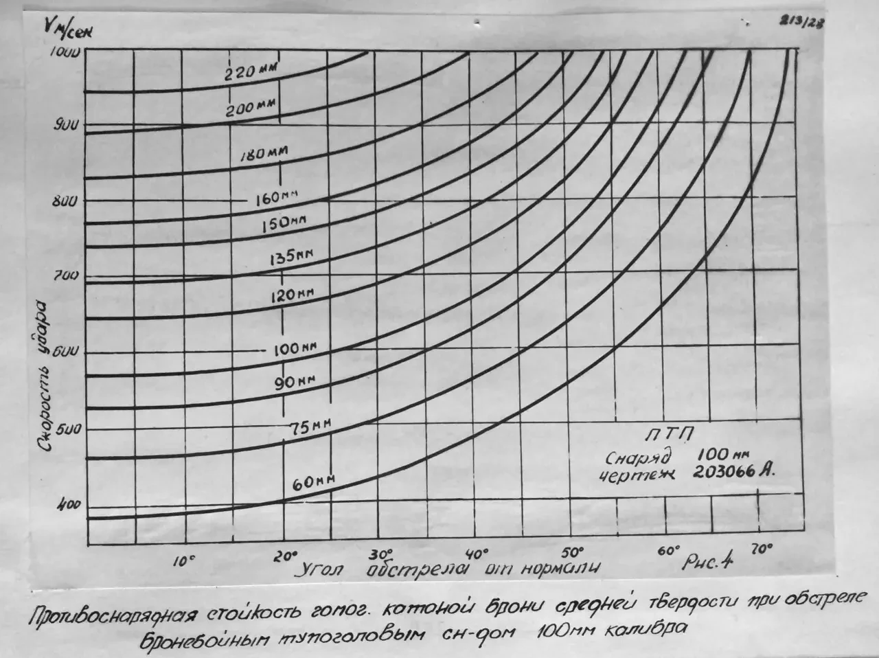 Однако, используя трофейные материалы Хиллерслебенского полигона, подробно о которых будет сказано ниже, данные Кубинского полигона по испытанию опытного объекта «260» немецкими 128-мм снарядами и имеющиеся данные по обстрелу отечественной брони немецкими снарядами меньших калибров, расчетным путем были получены тактические диаграммы противоснарядной стойкости отечественной гомогенной брони также против снарядов и этого калибра.