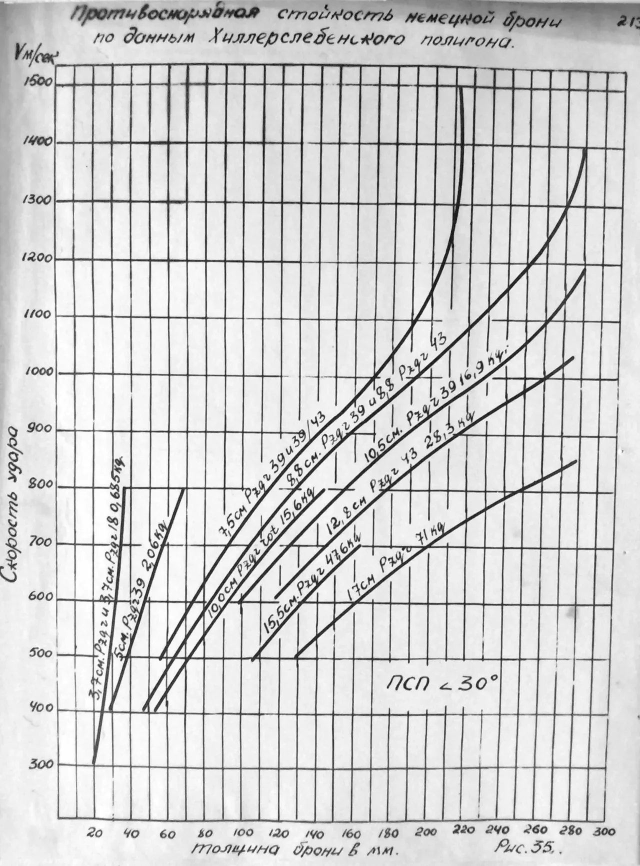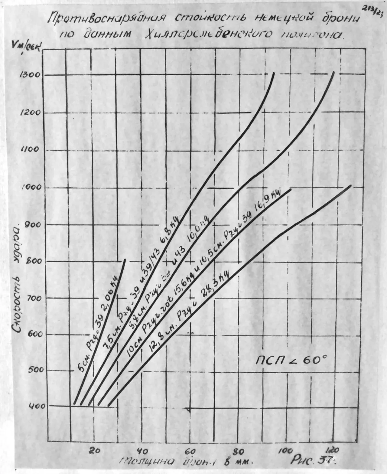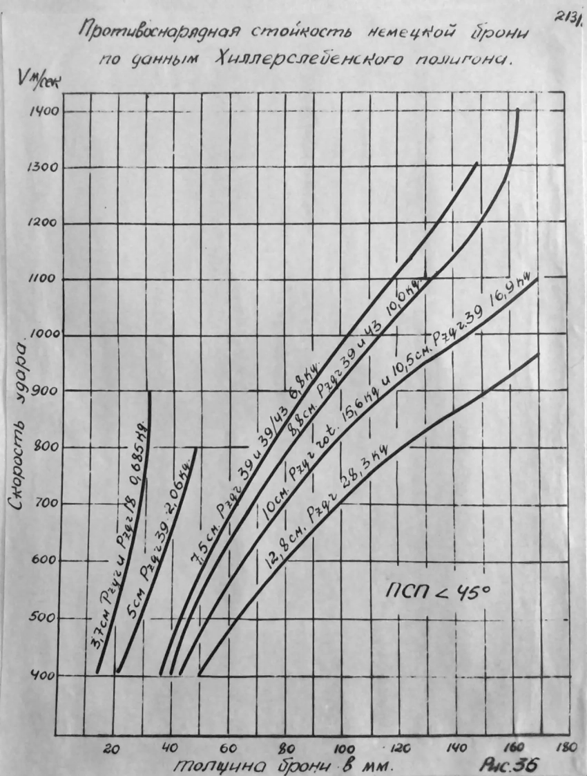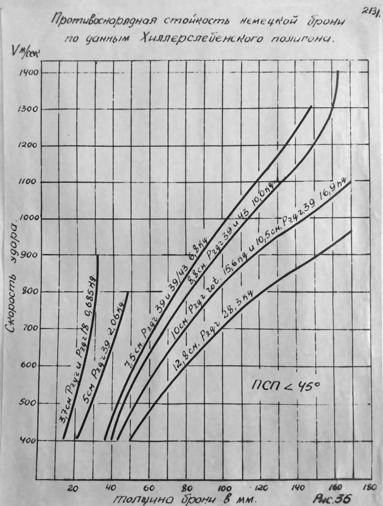 Прежде чем приступить к рассмотрению этих данных, следует отметить, что материалы Хиллерслебенского полигона, полученные из Арткома ГАУ ВС, представлены исключительно в виде графического материала, отражающего только противоснарядную стойкость немецкой брони под огнем их же противотанковой артиллерии, без какого-либо пояснительного текста, на основании которых возможно было бы установить некоторые сведения о свойствах немецкой брони и пр.