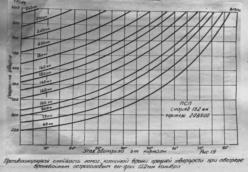 Таким образом, можно предположить, что представленные графические материалы по противоснарядной стойкости гомогенной брони в пределах реальных скоростей отечественных пушек калибров 100–152 мм с достаточной для практики точностью отражают тактические свойства гомогенной брони при различных условиях испытания и поэтому для этих скоростей снарядов могут быть рекомендованы как основной материал при расчете броневой защиты от снарядов этих калибров.