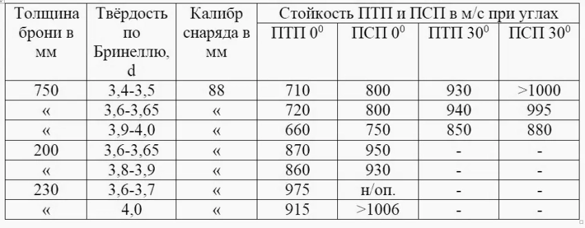 Ниже в таблице приведены данные противоснарядной стойкости гомогенных плит разной твёрдости.