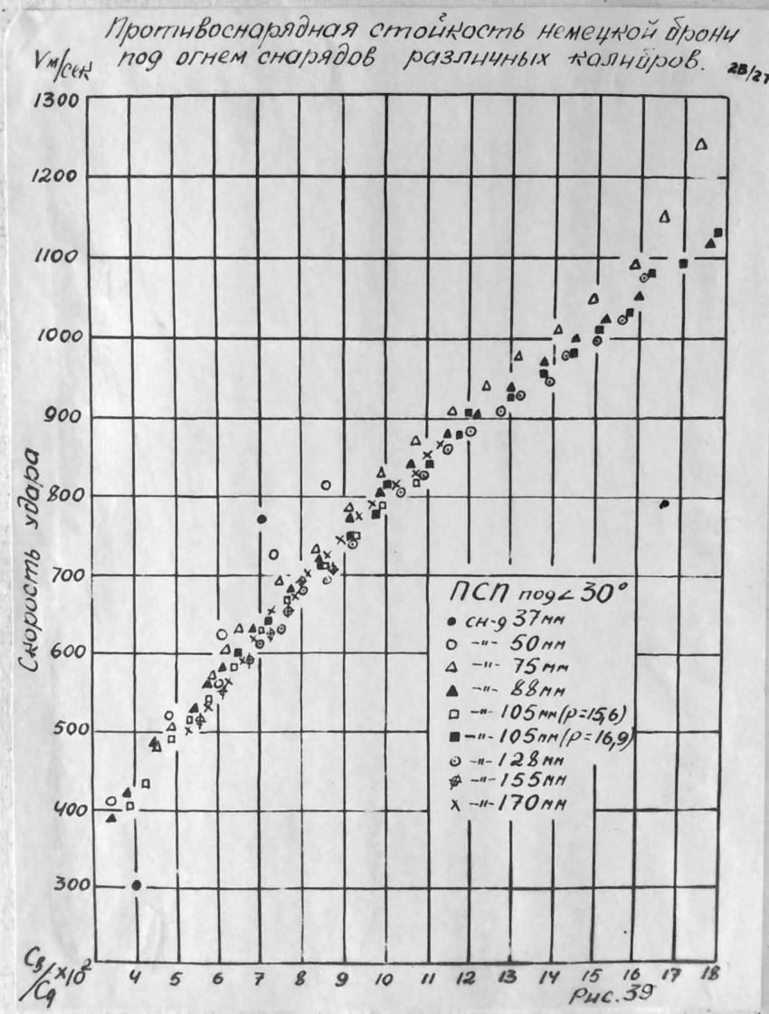Используя некоторые положения, установленные канд. техн. наук Айбиндером при анализе процесса бронепробития на основе теории подобия, авторы в результате обработки опытных данных полигонного испытания брони немецкими бронебойными снарядами калибра 50, 75, 88 и 105 мм пришли к выводу, что для снарядов подобной конструкции скорость, характеризующая противоснарядную стойкость брони, зависит только от отношения двух коэффициентов Сb к Сq, где: Сb = b/d (b — толщина брони и d — калибр снаряда) — так называемая относительная толщина брони и Сq = q/d3 (q — вес снаряда и d — его калибр) — так называемый относительный вес снаряда.