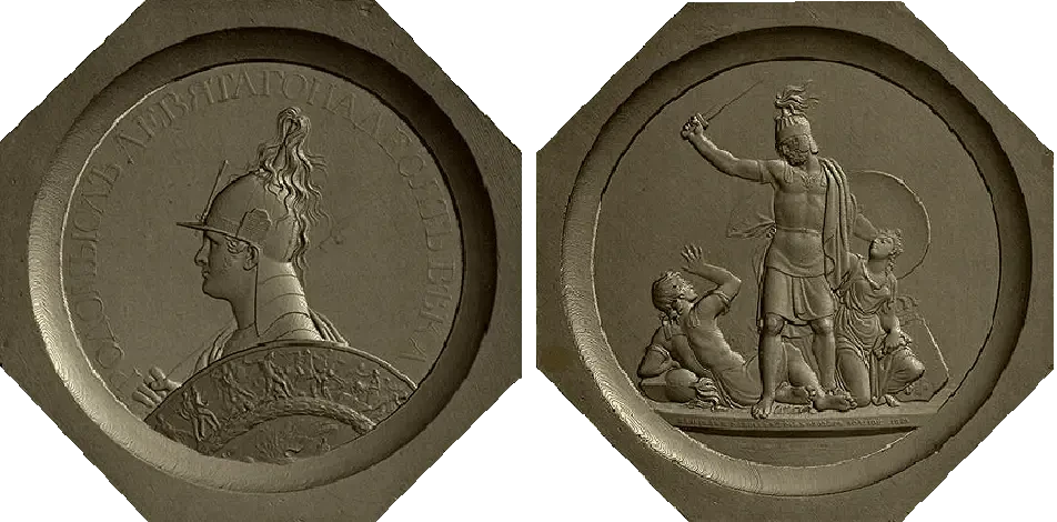 «Вооруженный мечом Русский воин, единою рукою поражая поверженного к ногам своим врага, другою, держащею щит, дружественно покрывает подносящую эту ключи от града Голландскую в виде жены столицу, и, утешая вещает ей: под щитом моим успокойся»