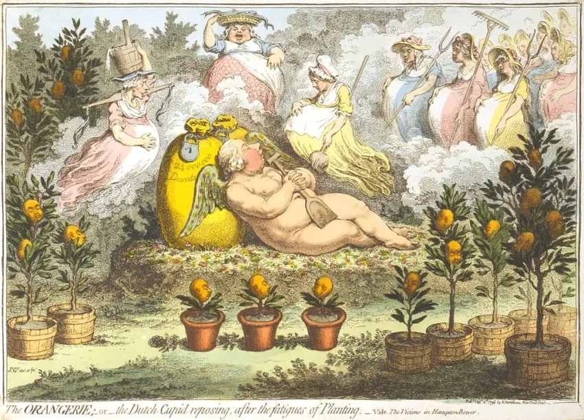 Карикатура Дж. Гилрея изображает изгнанного в Англию Вильгельма как беспечного Купидона, почивающего на мешках с деньгами в окружении беременных фей