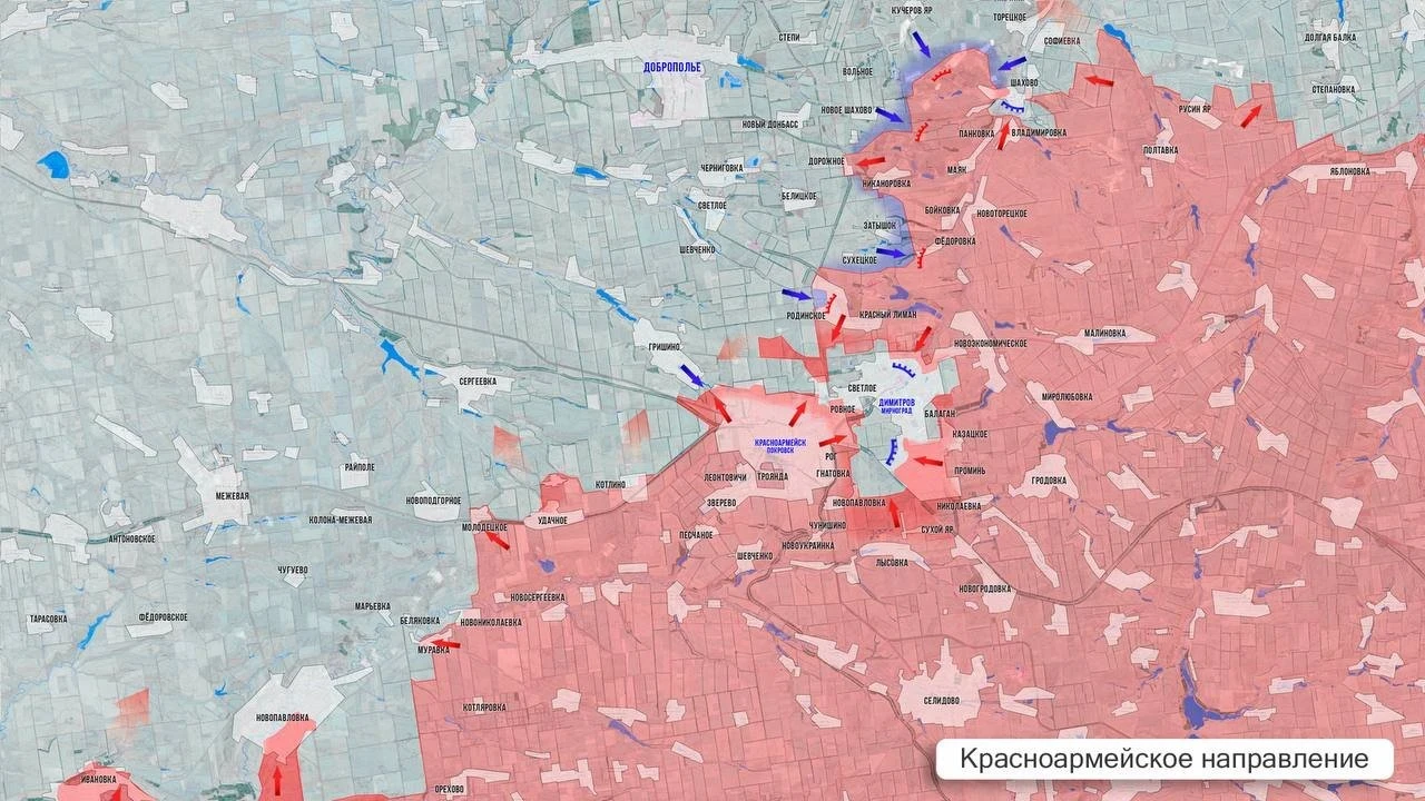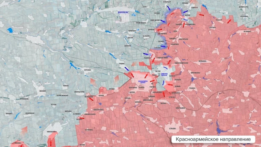 На Красноармейском фронте продолжаются бои севернее Котлино, идёт зачистка в мкр. «Центральный» и «Динас» в Красноармейске. В районе Димитрова ВС РФ сужают кольцо окружения, противник старается удерживать свои рубежи. В районе Добропольского выступа инициатива на стороне ВС РФ. Продолжаются бои в районе Шахово, Софиевки. Вдоль западного фланга выступа позиционные бои.