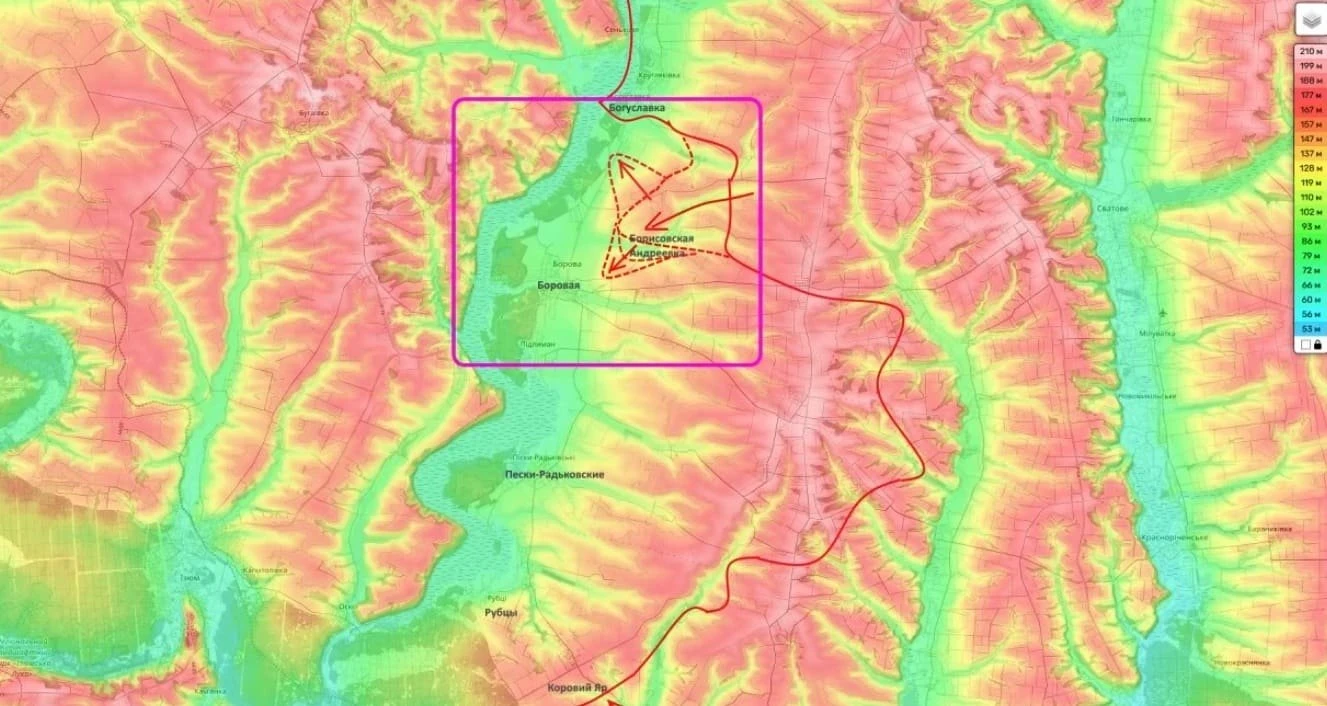 «До самой Боровой, до границы этого бывшего районного центра … Харьковской области осталось буквально менее 2 км. … Буквально одно поле - и мы сможем зайти в Боровую», - сказал блогер.