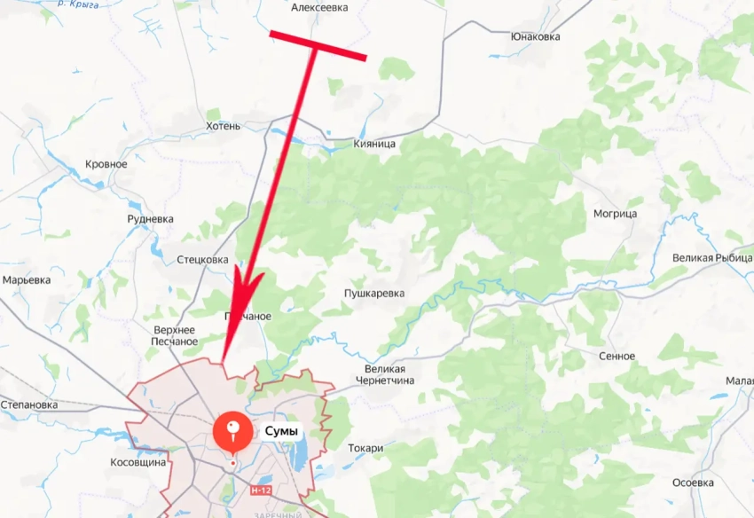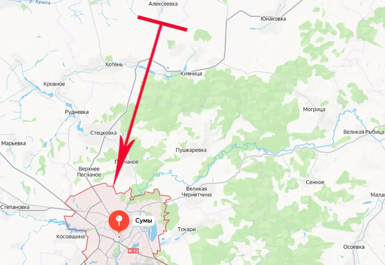Кратчайшее расстояние для российской армии до областного центра Сумы составляет примерно 17 км. Это дистанция от передовых позиций ВС РФ южнее Алексеевки.