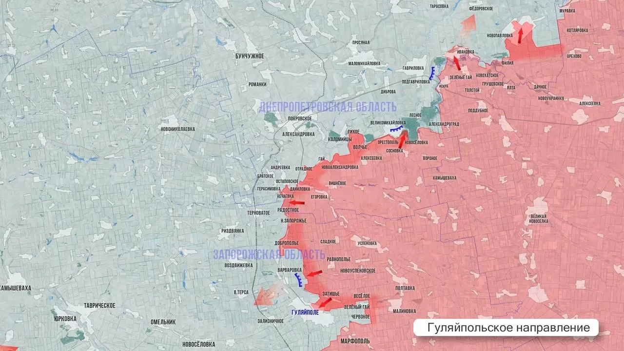 На Гуляйпольском участке фронта Министерство обороны РФ официально подтвердило освобождение населенного пункта Червоное. Штурмовые подразделения зашли в поселок на плечах отступающего противника сразу после взятия под контроль Зеленого Гая.