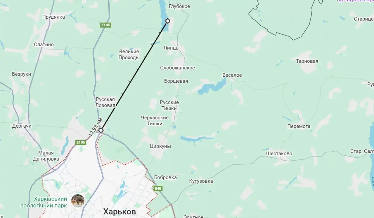 Что касается Сум, то кратчайшее расстояние от передовых позиций россиян в Алексеевке до этого областного центра на северо-востоке Украины составляет примерно 17 километров. До Харькова расстояние составляет чуть менее 18 километров от позиций ВС РФ южнее села Глубокое.
