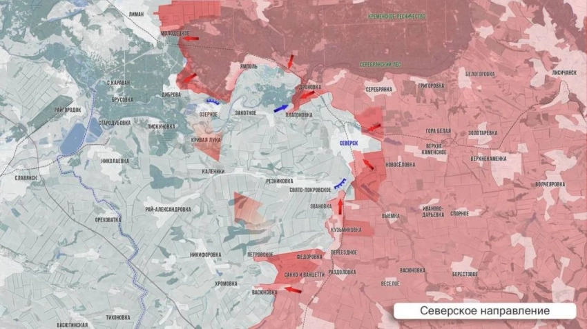 На Северском участке фронта в Северске оборона ВСУ все сильнее трещит в восточной части города. Вражеский гарнизон сосредоточен преимущественно в западной части Северска, за рекой Бахмутка. Мониторинг противника полагает, что почти 70% города находится в «серой» зоне. Наши бьются за Свято-Покровск, впереди штурм цепи опорников на высотах в районе села. Выше по фронту ВС РФ продвигаются южнее Дроновки, вышли на дорогу Закотное-Северск. По данным с мест, полностью зачищен Ямполь. Российские подразделения установили контроль над Ямпольским перекрёстком и расширили зону контроля южнее самого Ямполя, отмечает в своём Telegram-канале Олег Царёв.