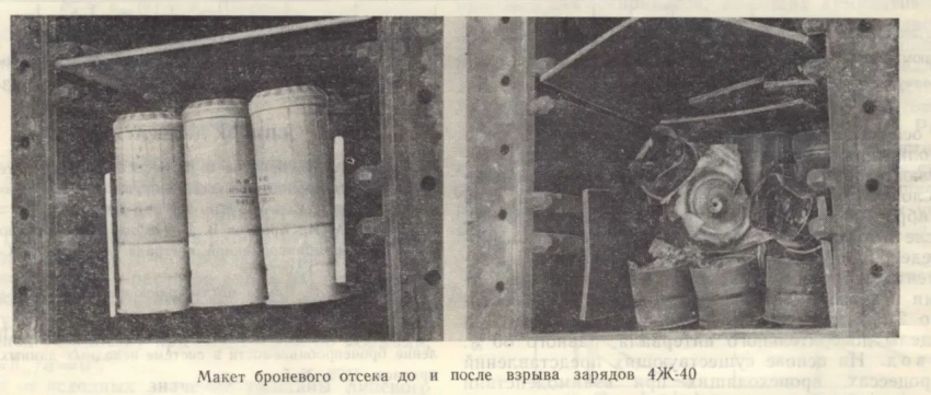 Иногда высказываются мнения, что вышибные крышки/панели — это прерогатива западного танкостроения, а у нас эта тема «не прокатит». Но нет, в Советском Союзе изолированные отсеки для боекомплекта с вышибными крышками активно испытывали с весьма обнадёживающими результатами. Для примера можно привести результаты испытаний отсека, в который были помещены 30 штатных танковых метательных зарядов и снаряды («Пути развития комплексной защиты танков»):