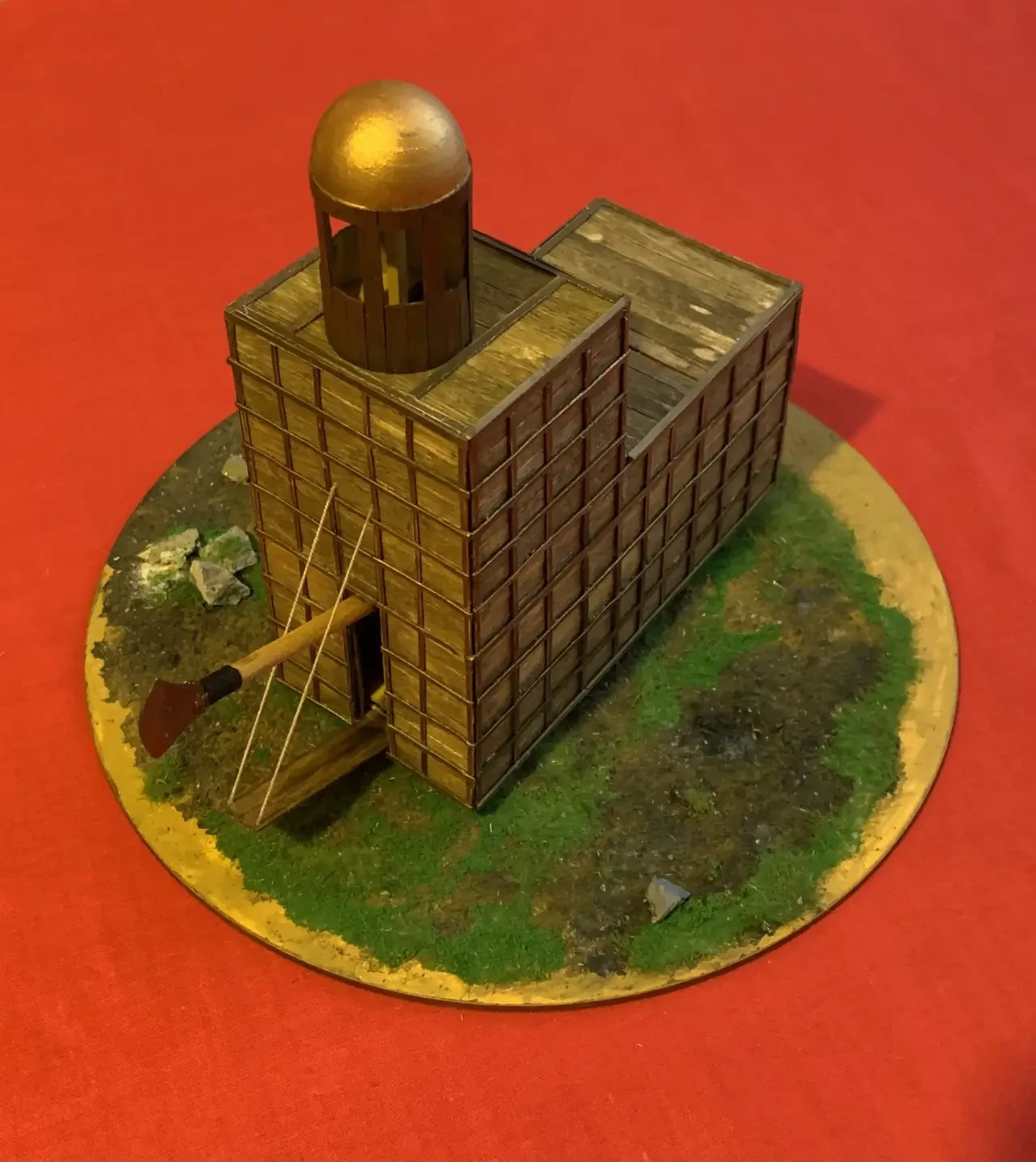 Основой башенки для лучников являются два диска для кукольных суставов диаметром 30 мм, склеенные между собой с помощью палочки для шашлычка. Высота получившегося цилиндра 40 мм. В нижнем диске заранее прорезается люк-лаз в подбашенное отделение. Доски, которыми «обита» башенка, имитируются полосками шпона фирмы «АВ-модель» шириной 4 мм. Они прекрасно склеиваются клеем ПВА. Полусферическая крыша – половинка деревянного шарика подходящего диаметра, также из магазина «Леонардо». Ее следует покрасить под медь или же под бронзу.