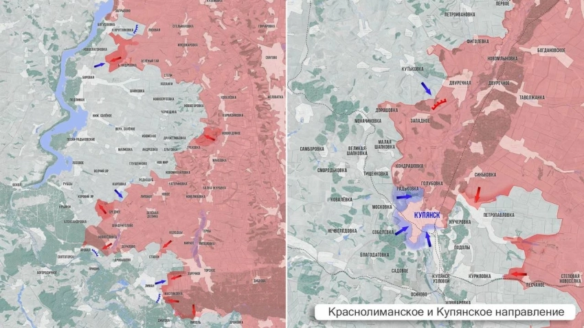 На Купянском участке противник не прекращает контратак. Основные удары приходятся в районе Садового, Соболевки и Московки. ВС РФ уничтожили колонну с подкреплением противника западнее города. На восточном берегу тяжелейшие бои в районе Купянска-Узлового. По словам Путина, в окружении здесь находится до 3,5 тыс. солдат ВСУ.