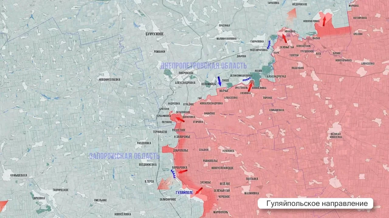 Южнее Гуляйполя фронт также пришел в движение. Российские бойцы наступают выше населенных пунктов Марфополь и Дорожнянка. В результате грамотных маневров удалось объединить плацдармы западнее Нового Запорожья и Доброполья. Вектор атаки направлен в сторону Косовцево и Рождественского.