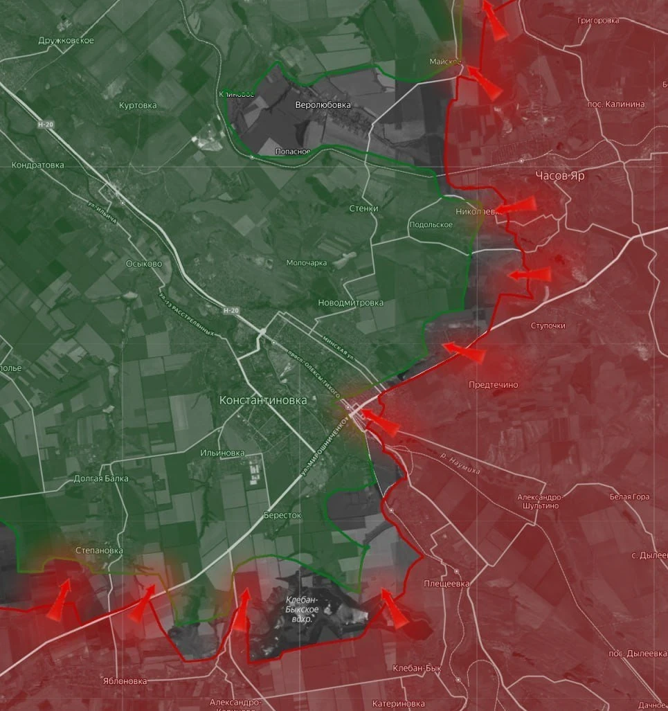 В самой Константиновке сохраняются позиционные бои у железнодорожного вокзала. Также продолжаются столкновения на подступах к Степановке и Берестку. В районе Часов Яра атаки ведутся в направлении Новомарково и Миньковки, часть последнего также контролируется не полностью.