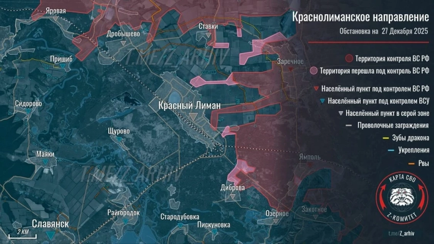 На западе от Северска армия России выравнивает линию фонта, постепенно наращивая давление на ВСУ юго-восточнее Красного Лимана. Российские бойцы имеют тактическое преимущество в Резниковке, продолжают выбивать противника из мощного укрепрайона в Закотном, есть продвижение западнее села. Идут бои за Озёрное.