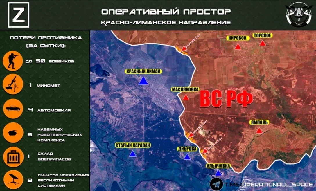 На Северском участке продолжаются бои в Резниковке. ВС РФ двигаются полями к северу и югу от дороги Резниковка-Рай-Александровка. МО сообщило об освобождении Дибровы. Вероятно, отсюда наши двинутся на северо-запад, в сторону дороги, соединяющей Красный Лиман и Славянск. Гарнизоны врага восточнее - в Озёрном и Закотном - скорее всего, будут лишены снабжения. Ресурсы врага признают бои в центре Закотного.