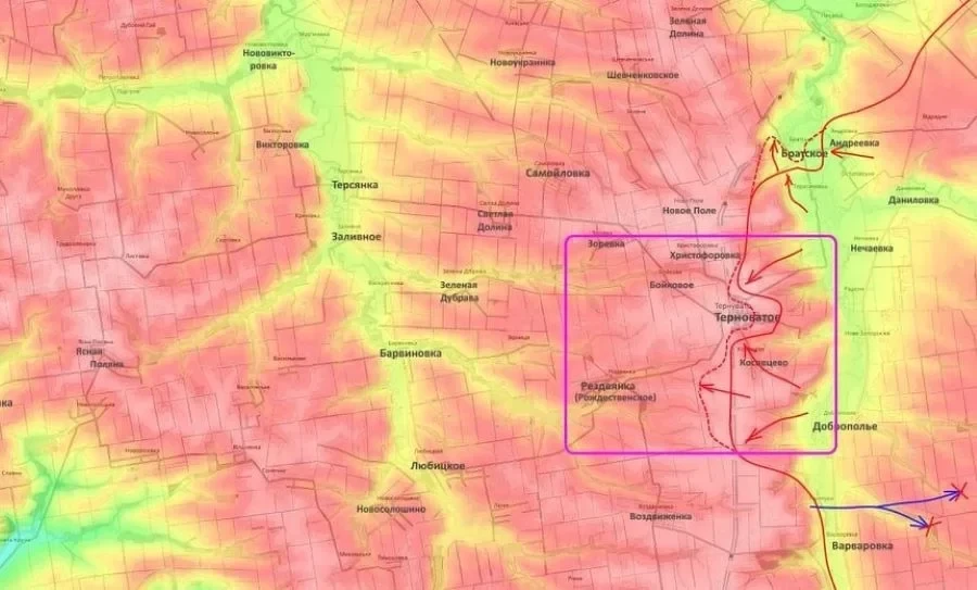 Повышенное внимание сегодня уделено району Терноватого. Здесь российские штурмовики ведут бои одновременно на южных, восточных и северных окраинах. Важным тактическим успехом стало преодоление железнодорожной насыпи южнее поселка и выход штурмовых групп на спуск с водораздельного хребта в сторону Рождественского.