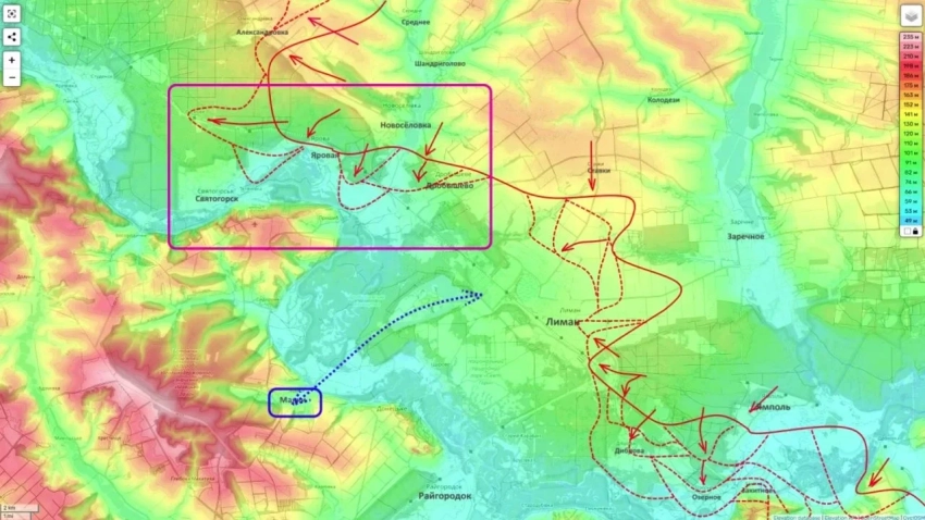 На подступах к Святогорску: Российские передовые отряды продвигаются западнее Яровой. Эксперты отмечают, что для начала полноценной операции по освобождению Святогорска необходимо окончательно установить контроль над Яровой.