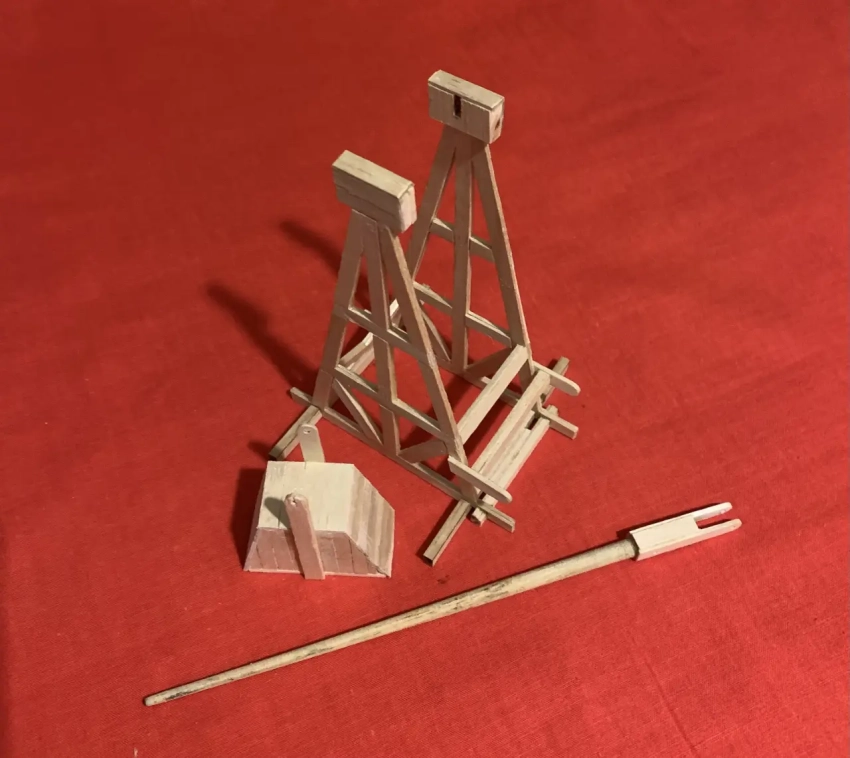 Теперь нам остается приложить этот рычаг с ложкой к одному из поперечных бревнышек так, чтобы с одной стороны было восемь частей, а с другой – две части, и прикрутить его к нему нитками слева и справа, но не туго. Рычаг на оси между стойками должен свободно вращаться! К короткому его концу нужно привязать (и приклеить!) две нитки, имитирующие канаты, и все – наша самоделка готова! Причем вы можете её покрасить в желтый цвет, чтобы она совсем-совсем была похожа на сделанную из свежеструганных бревен.