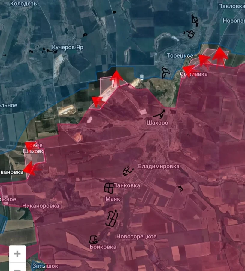 На Красноармейском направлении ВС РФ продавливают оборону в Новом Шахово, пробиваются на северо-запад от Шахово и на северо-восток от подконтрольной Софиевки.