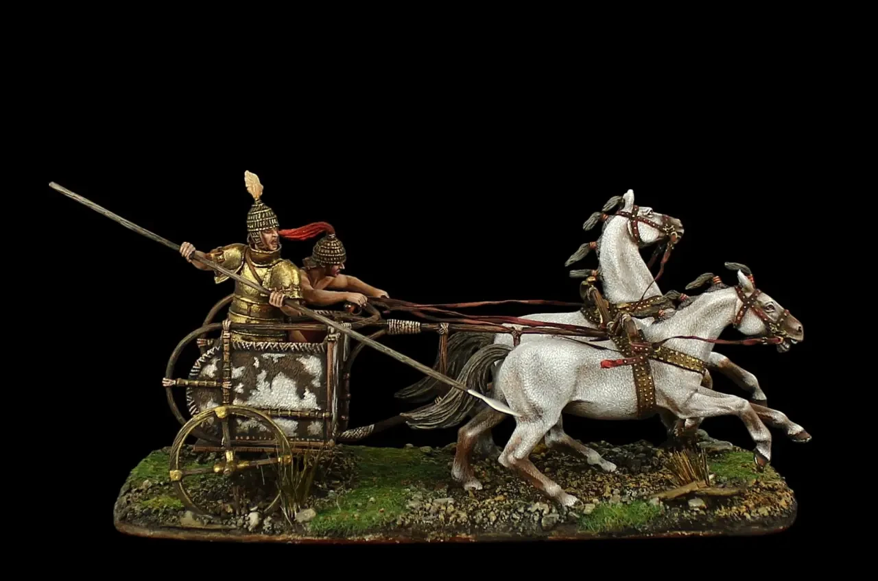 Миниатюра из «белого металла», изображающая египетскую колесницу в битве при Кадеше 1300 г. до н. э. Производитель: «Silver Dream Studio» и «El Viejo Dragon»