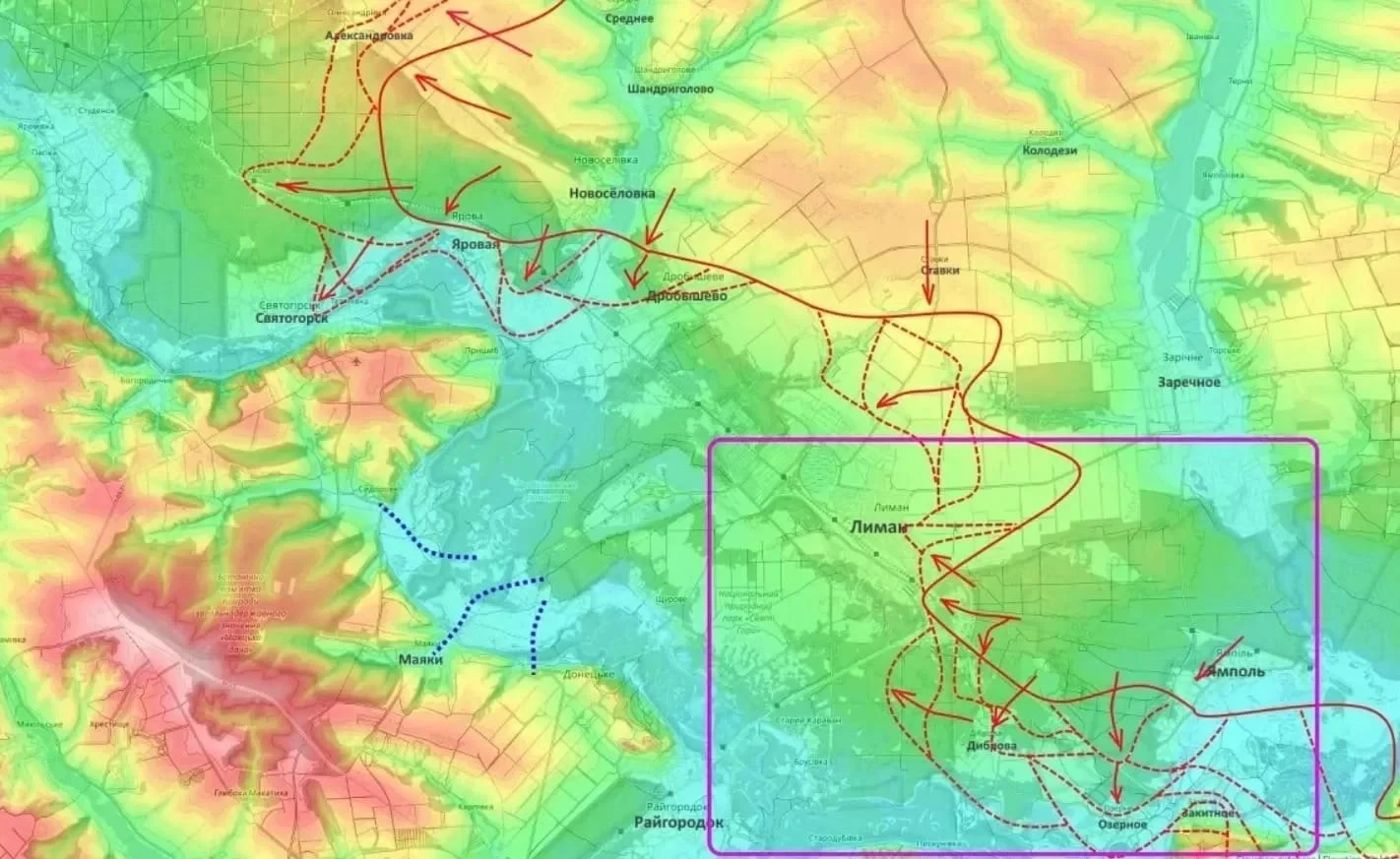 Бои уже идут непосредственно на северо-восточных и юго-восточных окраинах Красного Лимана. Одновременно развивается наступление от Дибровы на запад, в сторону населённого пункта Маяки, что создает угрозу полного окружения украинской группировки.