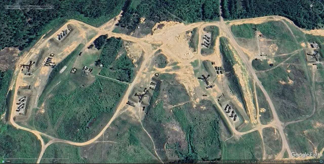 Спутниковый снимок Googlе Еarth: позиция ЗРС С-300ПТ в 40 км юго-западней Минска. Снимок сделан в августе 2022 года