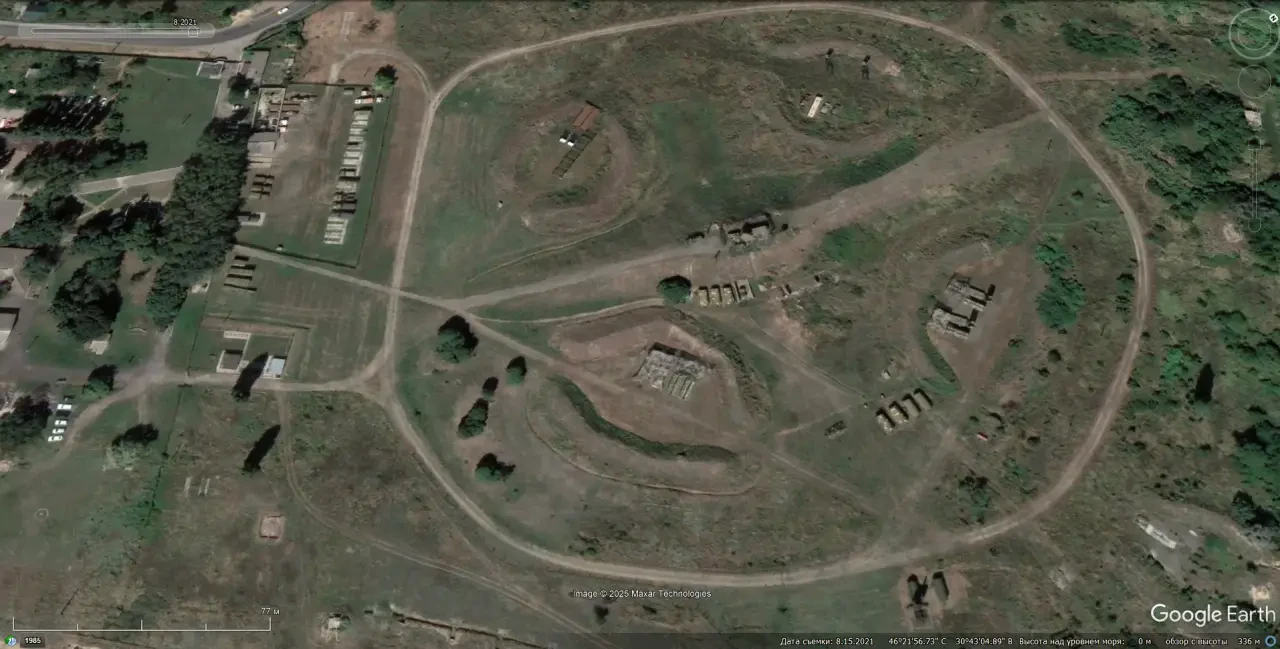 Спутниковый снимок Googlе Еarth: уничтоженная украинская ЗРС С-300ПС. На этой позиции расположенной южней города Алешки в Херсонской области до 2011 года был развёрнут дальнобойный ЗРК С-200ВМ. Снимок сделан в мае 2022 года
