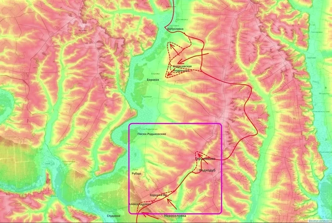 На Боровском участке фронта российские подразделения меняют тактику: после контратак врага на северо-западе от Боровой, удар наносится с юго-запада. Идет зачистка Редкодуба, занята большая часть Глущенково.