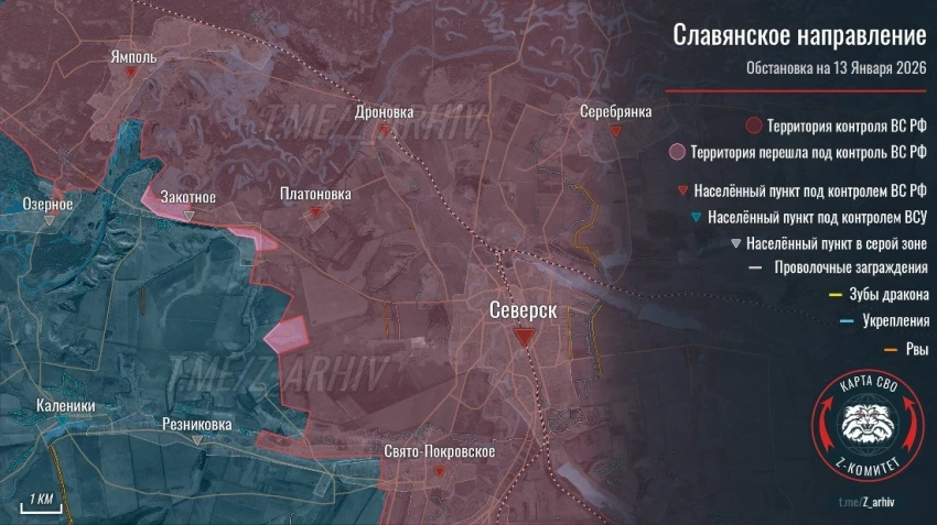 По состоянию на 13 января расстояние от российских позиций, расположенных к юго-востоку от Пришиба, до северной окраины Славянска составляет около 14,5 километров. От передовых позиций ВС РФ в районе села Диброва, которое находится южнее Красного Лимана, расстояние до Славянска составляет около 13,5 км.