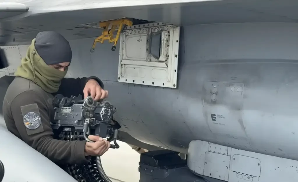Оружейник заряжает 20-миллиметровыми снарядами пушку M61A1