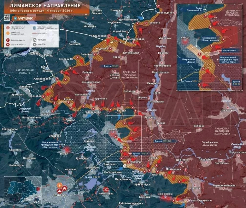 На Краснолиманском направлении российские силы теснят украинские формирования и постепенно продвигаются с севера и северо-востока к Славянско-Краматорской агломерации на Донбассе. К вечеру 15 января 2026 года, несмотря на плохую погоду, подразделения группировки войск «Запад» продолжали двигаться к городу Святогорск в ДНР.