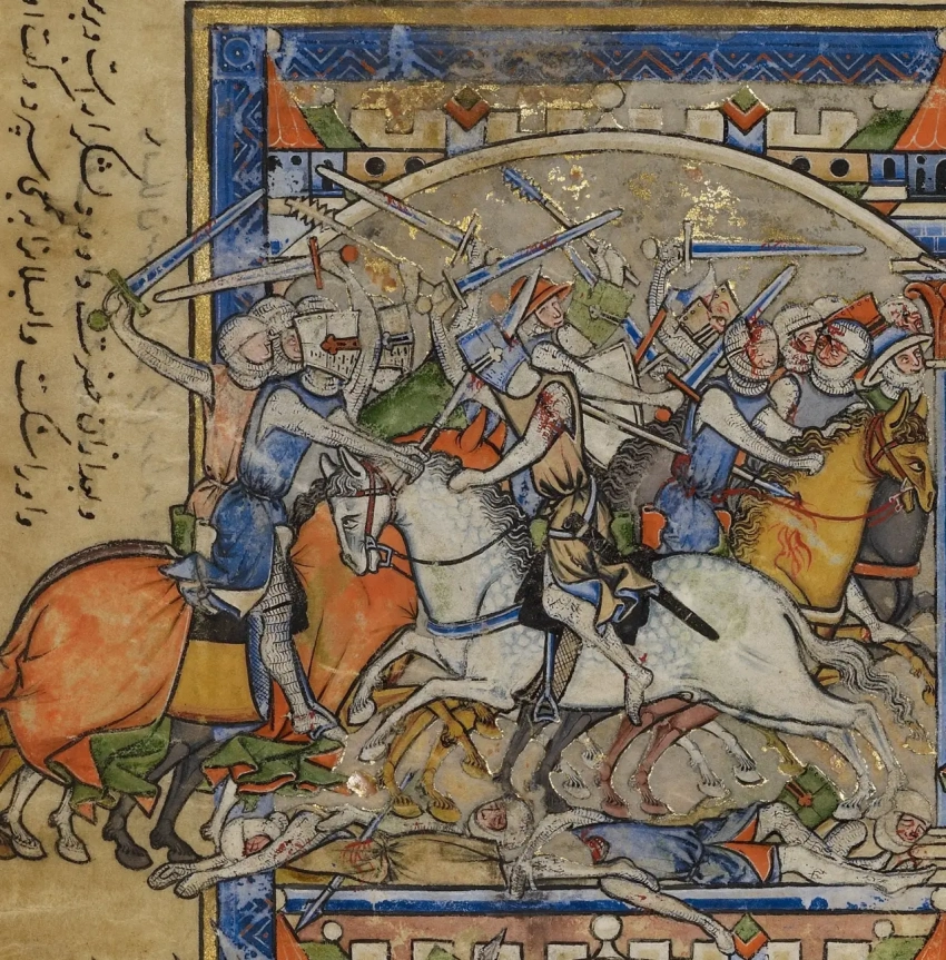 «Иоав преследует Саву до города Авел». Всадники в закрытых шлемах показаны без каких бы то ни было украшений, хотя шлем того, что в центре, и выкрашен в синий цвет. Миниатюра из «Библии Мациевского». Библиотека и музей Моргана, Нью-Йорк