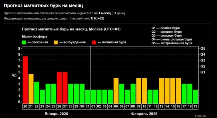 Январь 2026 года в целом проходит на фоне повышенной солнечной активности. Специалисты отмечают, что в течение месяца возможны ещё несколько периодов возмущений магнитного поля Земли.