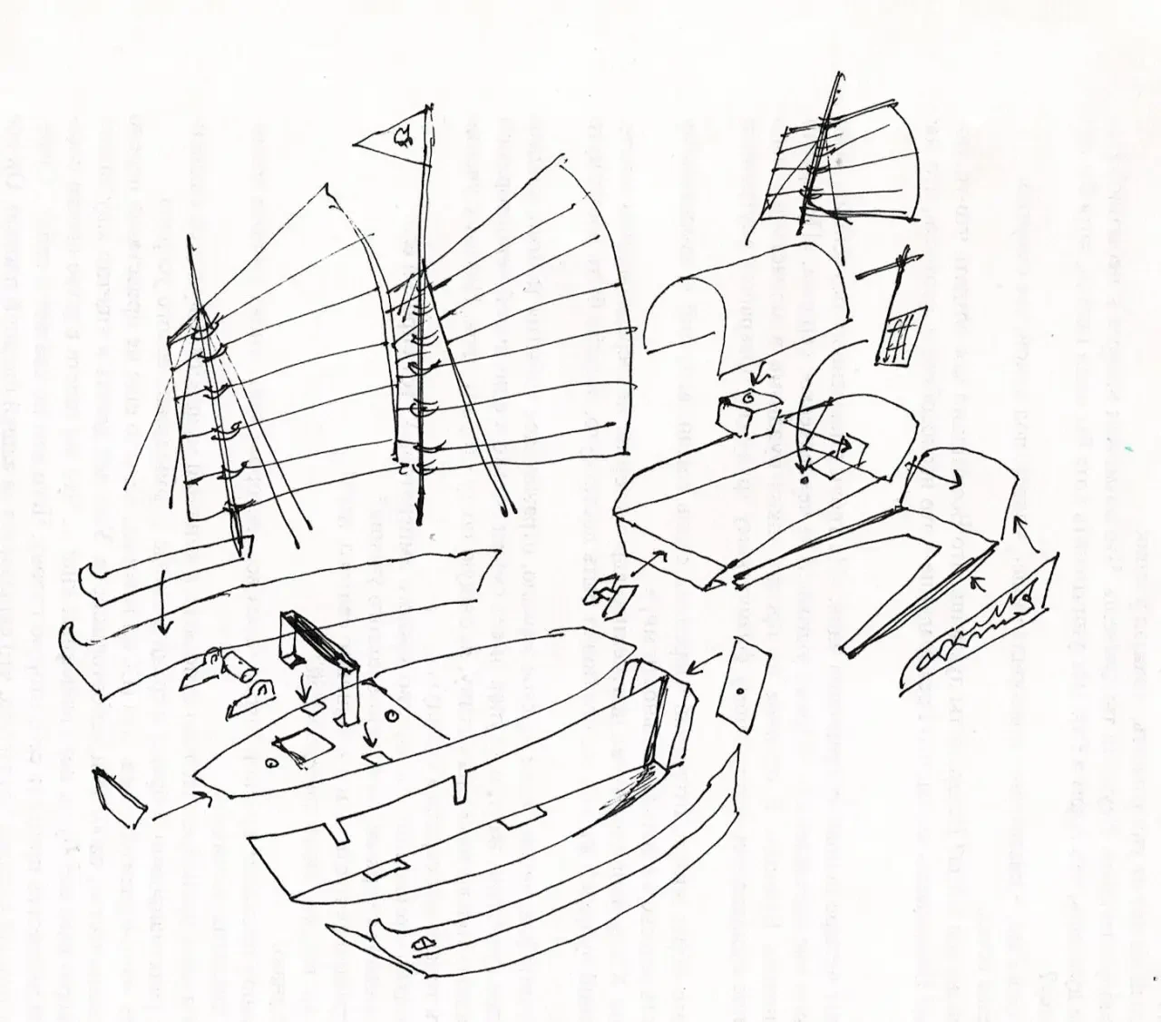 Паруса китайской джонки похожи на известный в Европе люгерный балансирный парус, причем он крепится на мачте так, что примерно треть его площади расположена с одной стороны, а две – с другой. Парус укреплен своеобразными латами, каждая из которых похожа на гик. Весьма солидная масса паруса со всеми этими латами способствует тому, что грубая и примитивная ткань (чаще всего мат, сотканный из бамбуковых волокон) хорошо расправляется и остается плоской даже в сильный ветер. На конце каждого «лата» – гика имеется отдельный шкот, с помощью которого достигается отличный контроль за парусами. В Китае для лат применяется прочный бамбук, и различия в их количестве на парусах часто обусловлены диаметром и качеством бамбука, доступного в данной местности: хрупкий и тонкий бамбук заставляет увеличивать число лат.