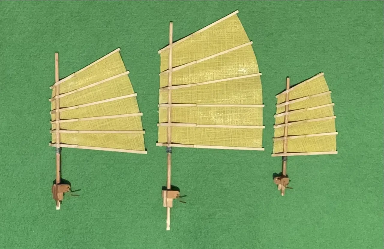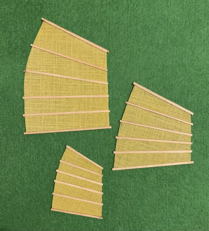 Паруса – из любой тонкой ткани с рельефным плетением, чтобы в готовом виде они бы выглядели так, словно они были сшиты из бамбуковых циновок