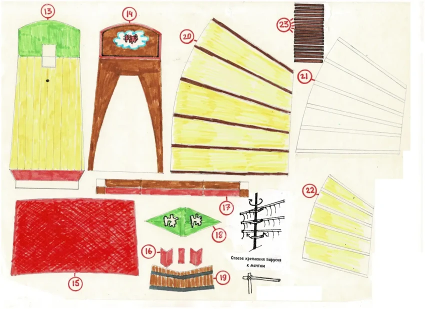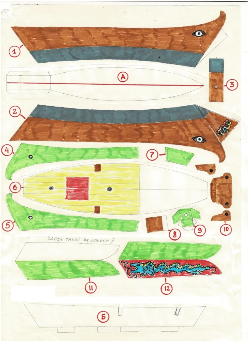 Развертки с деталями джонки: А – днище, Б – продольная переборка («ребро жесткости»), 1 – правый борт, 2 –левый борт вместе с носовой оконечностью, 3 – транец с отверстием для крепления руля, 4, 5 – левая и правая накладки на переднюю часть деталей 1 и 2, 6 – палуба, 7 – внутренняя накладка на нос, 8 – вал брашпиля (свернуть в трубочку), 9 – степс (гнездо) бизань мачты, 10 – детали брашпиля, 11, 12 – расписные борта кормовой палубы (перегибаются пополам!), 13 – кормовая палуба, 14 – внешняя часть кормовой палубы, 15 – тент из бумаги, 16 – детали лестницы на кормовую палубу, 17 – опора уложенной мачты (перегибается пополам!), 18 – флаг (лучше вырезать из ткани и покрасить акриловой краской), 19 – лопасть руля (перегибается пополам, 20, 21, 22 – паруса с расположенными на них реями, 23 – крепления реев к мачтам (из бумаги). Рисунок автора