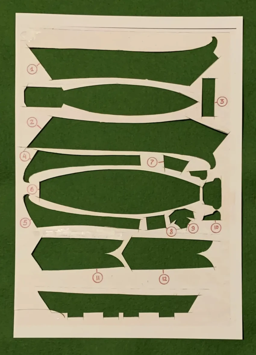 После этого в корпус вклеивается палуба: сначала передняя палуба 6, затем ее задняя часть 13, на которую с обратной стороны приклеивается деталь 14. Детали 11 и 12 наклеиваются соответственно слева и справа. Красный фон, на котором нарисован голубой дракон, можно подкрасить фломастером, а вот все остальные части корпуса, кроме разве что палубы, красятся акриловыми красками. Ватерлиния – тонкая (1 мм) полоска чёрной бумаги.