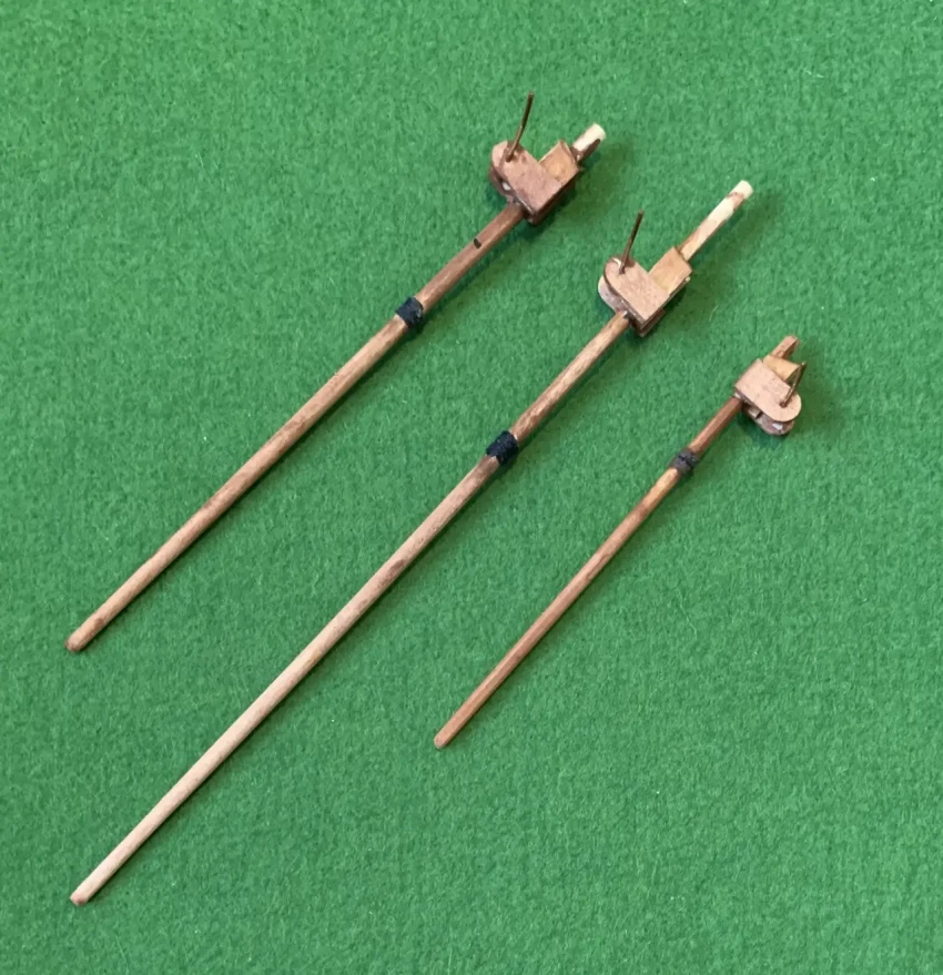 На нашей модели эти «латы» выполнены из реек шириной 2 мм фирмы «АВ-модель», но можно точно так же вырезать их из бумаги. На мачту парус «надевается» с помощью таких же полосок (или реек), которые выгибаются и приклеиваются к латам так, чтобы под них можно было бы просунуть мачту. Длина таких полосок из реек должна быть не меньше 30 мм, иначе они будут ломаться, а вот если они бумажные, то размеров деталей 23 для того, чтобы закрепить паруса на мачтах, будет вполне достаточно.