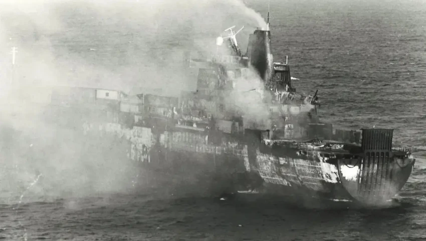 После того как пара ракет отправила транспорт на дно, британскому десанту пришлось топать к Порт-Стэнли пешком (а кроме того — есть сухпайки, спать под открытым небом и обходиться без полевых сортиров: полевые кухни, палатки и туалеты также утонули). Всего на дно пошло техники и имущества на 100 миллионов фунтов. Интересно в этом то, что в контейнеровоз аргентинские пилоты не целились: они хотели попасть во фрегат типа 21 «Эмбаскейд», но тот выпустил пассивные помехи, которые и увели ракеты в «Атлантик Конвейер»...