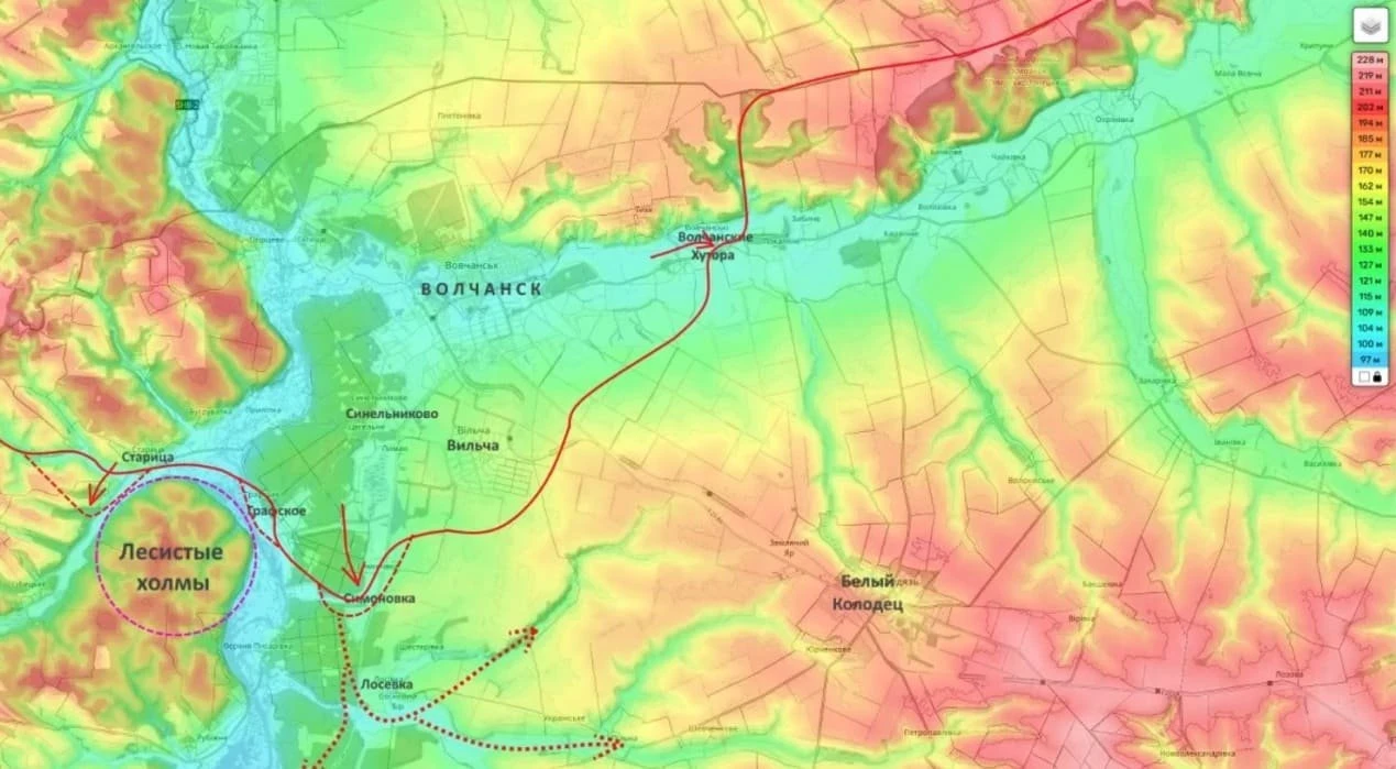 По его мнению, замысел российского командования заключается в том, чтобы выйти к Белому Колодезю не с фронта, а с тыла. Используя складки местности, холмы, растительность в речных балках и сеть украинских укреплений, передовые подразделения ВС РФ смогут максимально скрытно подойти к селу и нанести удар по обороне ВСУ в ее наиболее уязвимом месте.