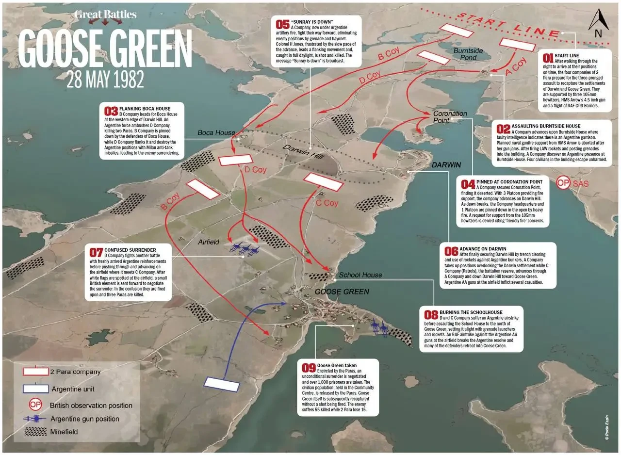 Подполковник Герберт Джонс разработал план атаки: ночью с 27 на 28 мая 2-й парашютный батальон должен был прорвать аргентинские укрепления, а 28 мая взять посёлки Дарвин и Гуз-Грин. Для штурма парашютисты получили подкрепление — 3 105-мм гаубицы, но вечером на позиции совершил налёт аргентинский «Скайхок», ранивший одного из командиров артиллерийских расчётов, которого пришлось срочно заменять.