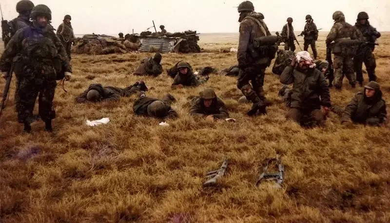 Британские парашютисты с аргентинскими поенными под Гуз-Грин