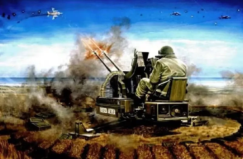 Аргентинская зенитка "Рейнметалл" Rh 202 ведёт огонь по британским самолётам. Художник Эзекиль Мартинес