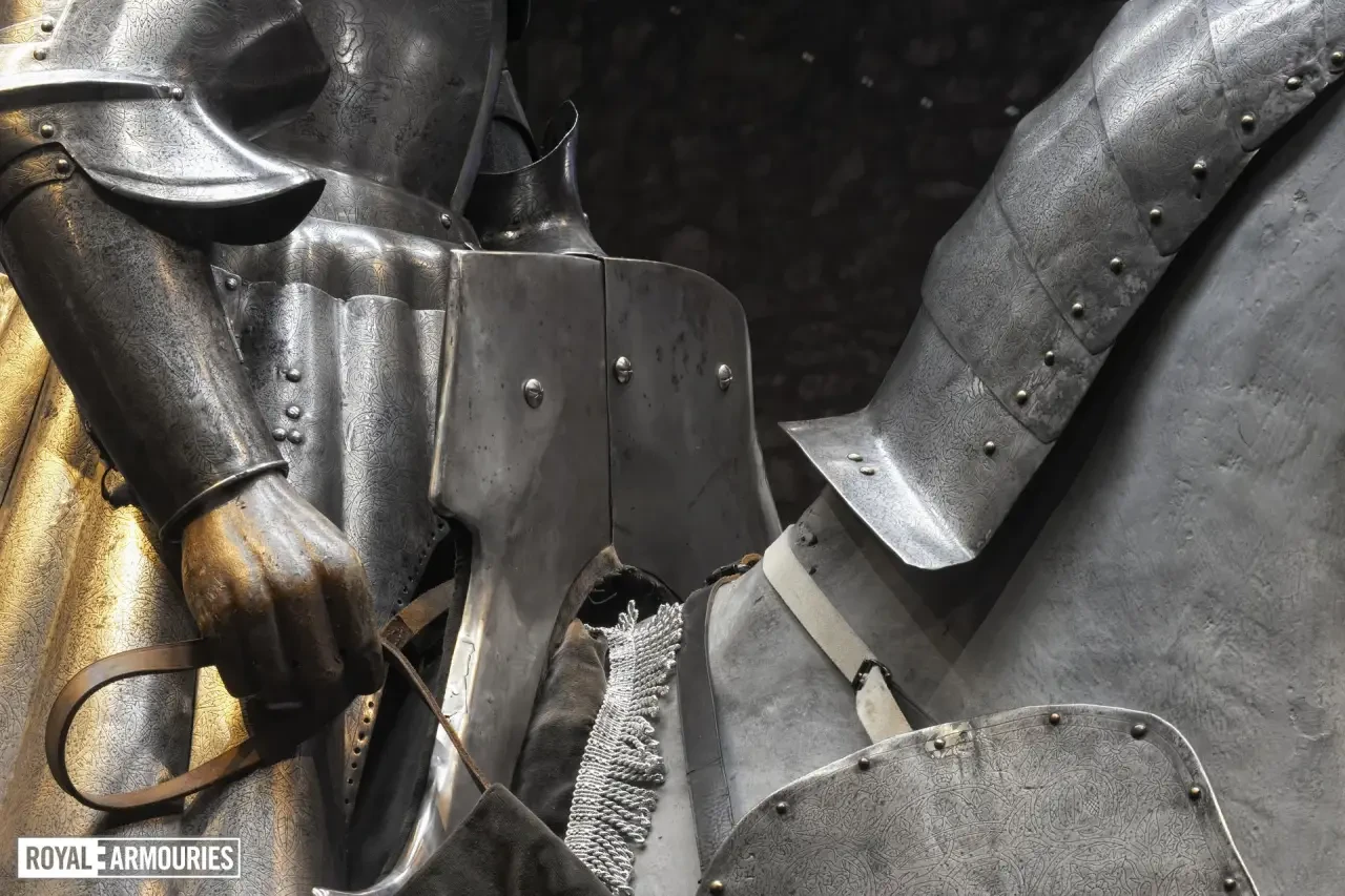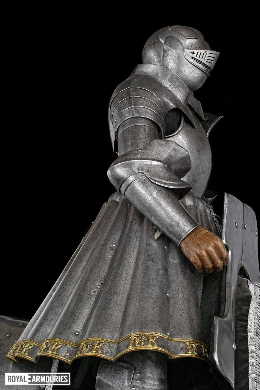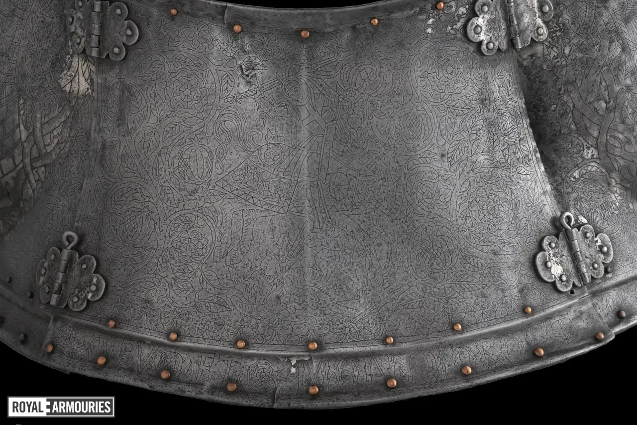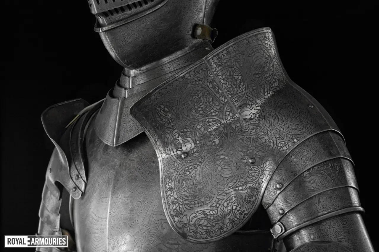 Интересно, что доспехи эти украшены множеством гравированных элементов. Металла, свободного от гравированных изображений, на них практически нет совсем. На нагруднике изображен Святой Георгий, а на спине — Святая Варвара. Остальная часть доспехов украшена узором из вьющихся ветвей, из которых произрастают тюдоровские розы и гранаты Гранады, а на набедренниках — геральдические лилии.