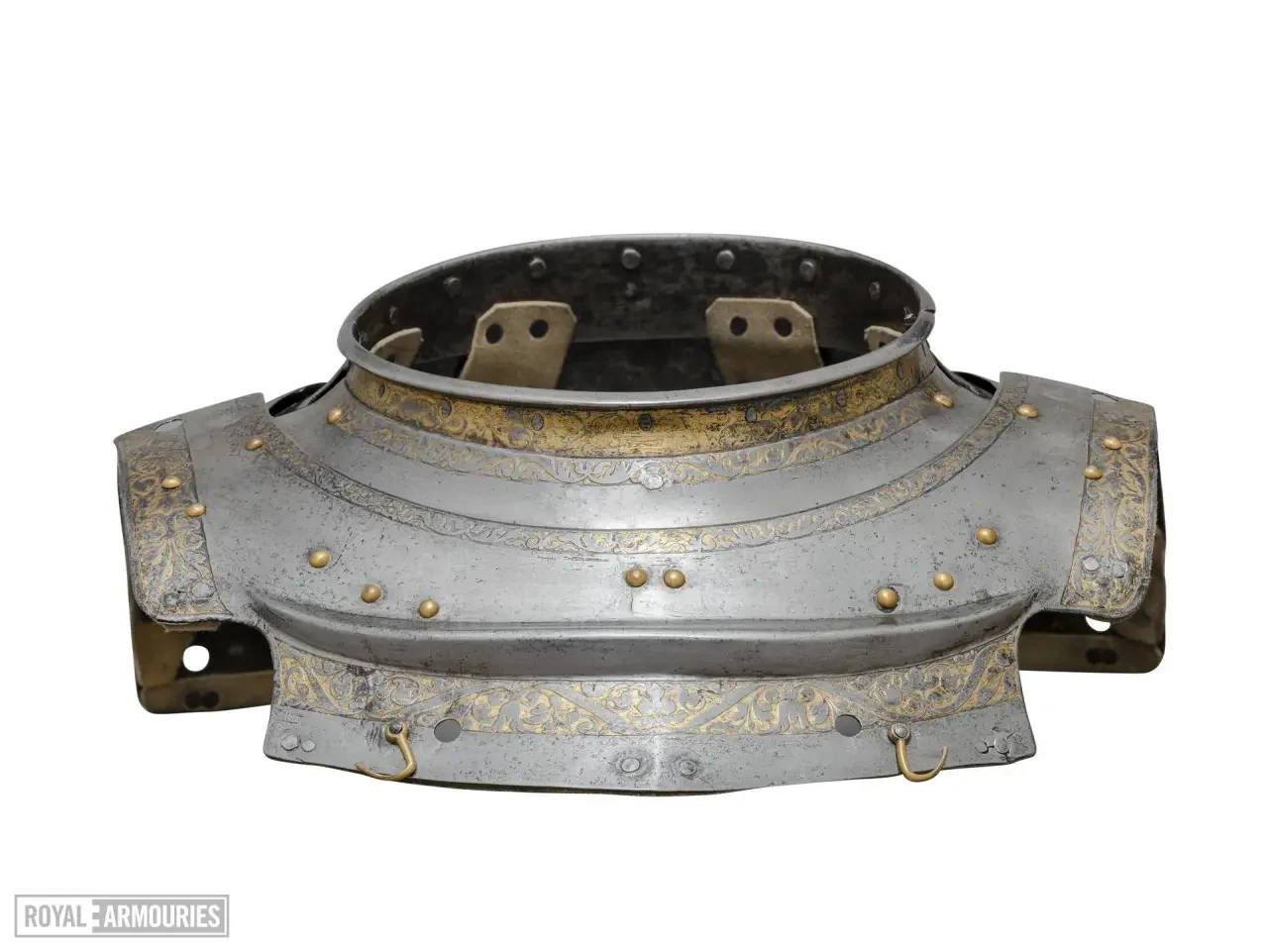 Наплечники разного размера: левый больше, причем верхняя часть его пластины продолжается в виде вертикального ребра для защиты шеи. Основная пластина правого наплечника также образует защиту шеи, но ниже, наплечник неглубокий спереди, чтобы обеспечить опору для копья. Следует отметить, что нагрудник не предназначен для крепления крюка для копья, что подразумевает, что изначально эти доспехи были снабжены альтернативным нагрудником и предназначались для конной схватки. Но затем к ним приделали «юбку» и они превратились в доспехи для пешего турнира!